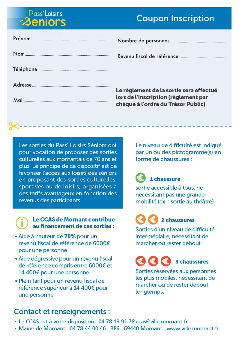 Le Pass’Loisirs Seniors a pour vocation de proposer des sorties aux Mornantais de 70 ans et +. Le principe de ce dispositif est de favoriser l’accès à des sorties culturelles, sportives ou de loisirs, à des tarifs avantageux en fonction des revenus des participants.