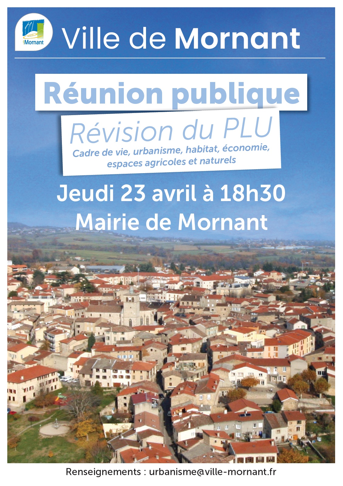 La ville de Mornant vous invite à une réunion publique sur la révision de son PLU (Plan Local d'Urbanisme). Un moment d'échange pour aborder des sujets qui nous concernent tous : urbanisme, habitat, cadre de vie, économie, espaces agricoles et naturels.