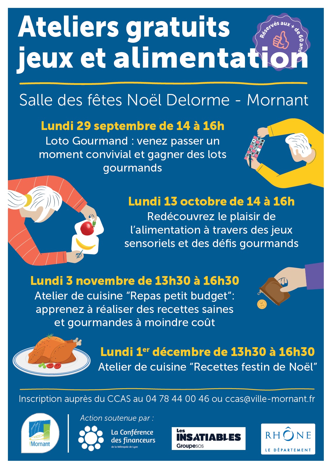 Le CCAS de Mornant, en partenariat avec La Conférence des financeurs, Les Insatiables et le Département du Rhône, propose aux personnes de plus de 60 ans, des ateliers gratuits "jeux et alimentation".